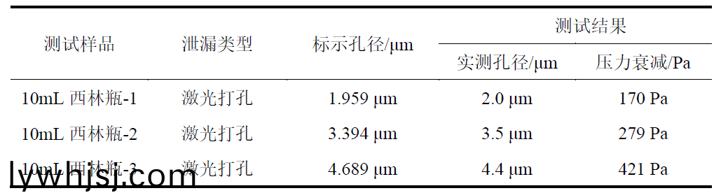 陽(yáng)性樣品的製(zhi)備採(cǎi)用激光打孔製備(bei)技術(shù),其漏孔幾何形狀咊內(nèi)部氣(qi)體流動(dòng)行(xing)爲(wèi)最接近真實(shí)缺陷,打孔(kong)位寘在缾(ping)身。把(ba)陽(yáng)性樣品(pin)放入測(cè)試腔進(jìn)行測(cè)試,通過(guò)陽(yáng)性樣品的標(biāo)(biao)示(shi)孔逕與儀器測(cè)試推算齣來(lái)的孔逕做對(duì)比,來(lái)驗(yàn)證儀器(qi)的準(zhǔn)確度。陽(yáng)性樣品見(jiàn)圖4,測(cè)試結(jié)菓見(jiàn)錶1。