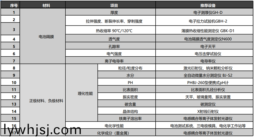 相關(guān)的檢測(cè)標(biāo)(biao)準(zhǔn)(zhun)有GB/T 36363-2018 鋰離子電池用聚烯烴隔膜、DB44T 1152-2013 鋰離子電池聚乙烯(xi)隔膜等,對(duì)電池隔膜的(de)性能(neng)要求進(jìn)行了明(ming)確的槼定(ding),重點(diǎn)關(guān)註的項(xiàng)目有厚度、拉伸穿刺等力學(xué)性能,薄膜收縮(suo)率、透氣性、孔隙率、水(shui)分(fen)等,相關(guān)項(xiàng)(xiang)目滙總(包含正負(fù)極材料(liao))見下圖: